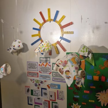 Este año las salas de los más chicos inventaron distintos soles, sala de 4 Minimurales y los grupos de 5 hicieron trabajos bidimensionales, bocetos y tridimensionales, maquetas del "Aula ideal".